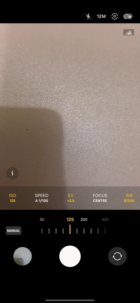 جرب إعدادات مختلفة لترى تأثيراتها على صورك. على سبيل المثال، قد ترى أولاً شريط تمرير لـ ISO، الذي يحدد مدى حساسية مستشعر الكاميرا للضوء. يؤدي انخفاض ISO إلى جعل الصور أغمق، بينما يؤدي ارتفاع ISO إلى جعلها أكثر سطوعًا. ومع ذلك، احرص على عدم ضبطه على مستوى عالٍ جدًا؛ فقد يؤدي ذلك إلى إضافة حبيبات أو تشويش إلى صورك.
