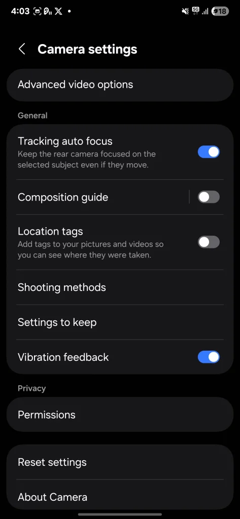 لتشغيل خطوط الشبكة، افتح تطبيق الكاميرا وانقر على أيقونة الإعدادات (settings). في قائمة الإعدادات، قم بالتمرير لأسفل إلى قسم عام (General) وانقر على دليل التركيب (Composition Guide). من هنا، يمكنك اختيار خطوط الشبكة والمستوى (Grid lines and level) لتمكين كل من الشبكة ومستوى الأفق، أو حدد خطوط الشبكة فقط (Grid lines only) إذا كنت تفضل استخدام الشبكة فقط. هذه الخيارات تساعد في تكوين الصورة بشكل احترافي.