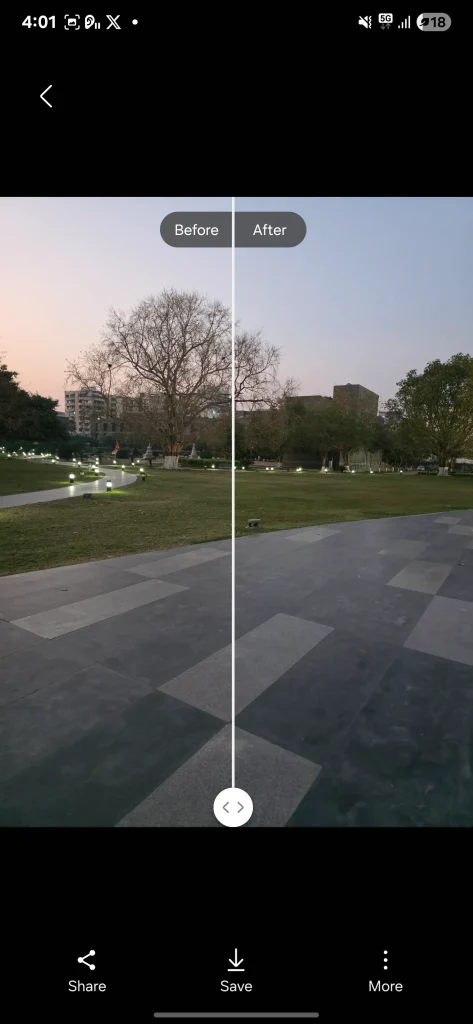 سيعالج الهاتف الصورة ويعرض لك الإصدارات قبل وبعد. يمكنك سحب شريط التمرير لرؤية الفرق، وإذا أعجبتك النتيجة، فانقر فوق Save للاحتفاظ بالتغييرات. هذه الميزة مفيدة بشكل خاص لإصلاح الصور الضبابية أو تلك ذات الإضاءة السيئة.