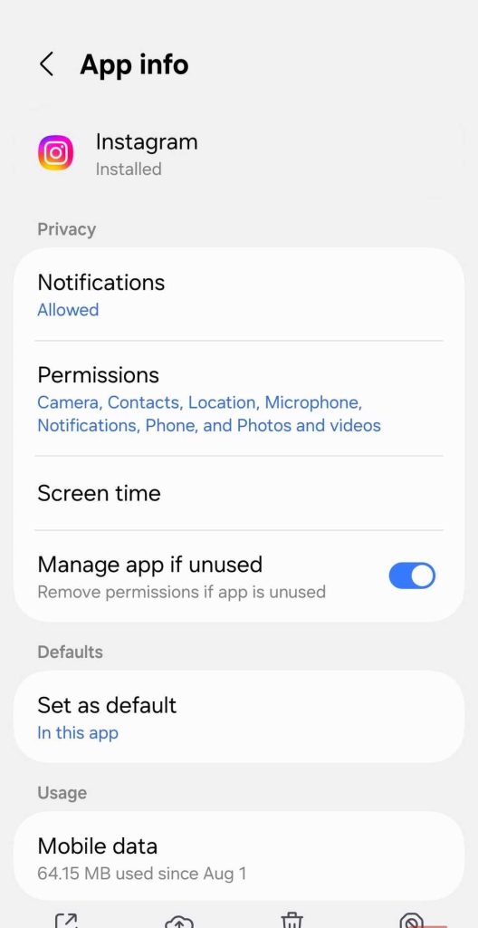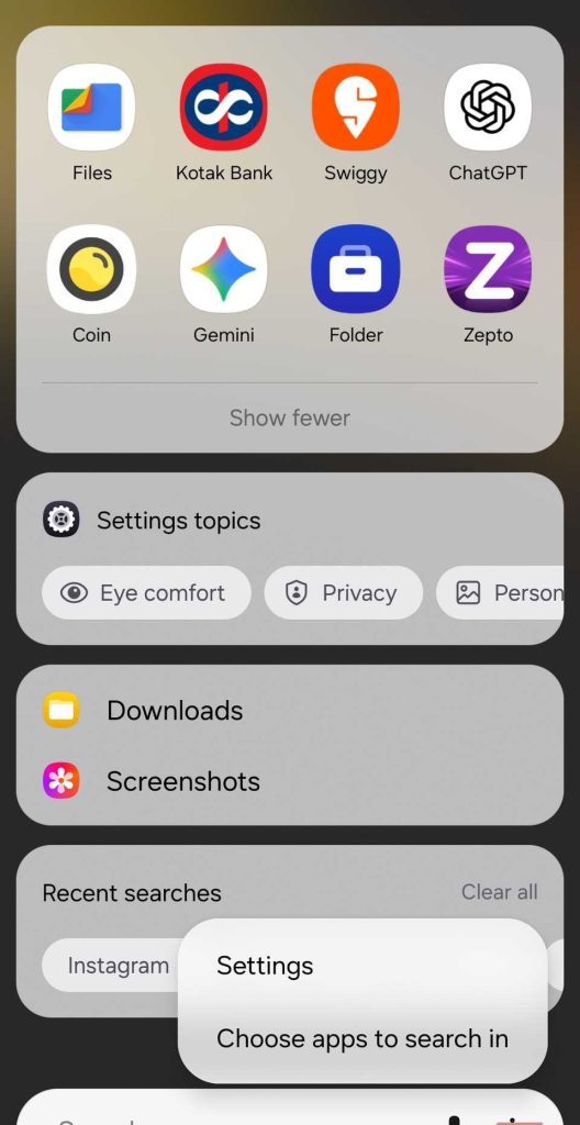 افتراضيًا، يعرض البحث في درج التطبيقات اقتراحات ذات صلة من جميع التطبيقات المتوافقة على هاتفك. ولكن ليس من الضروري أن يظهر كل تطبيق في هذه النتائج – ربما لا تريد اقتراحات من Samsung Music أو Netflix في كل مرة تكتب فيها شيئًا.