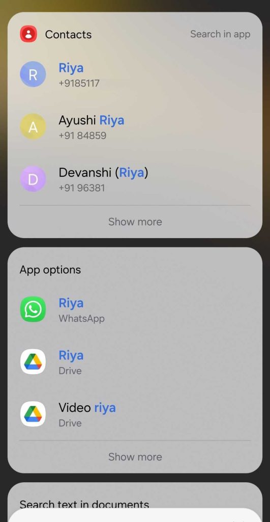 اكتب اسمًا في شريط البحث في درج التطبيقات، وستظهر جهة الاتصال هناك مباشرةً في النتائج. انقر عليه، وسيتم نقلك مباشرة إلى تطبيق جهات الاتصال. ضمن قسم خيارات التطبيق في نتائج البحث، سترى خيار WhatsApp، حتى تتمكن من الانتقال مباشرة إلى الدردشة. إذا قمت بالتمرير قليلاً، فسيعرض قسم الهاتف بشكل أنيق سجل مكالماتك مع جهة الاتصال المحددة.