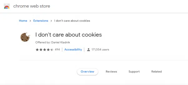 تُعد إضافة “I don’t care about cookies” المتوفرة لمتصفح فايرفوكس و Chrome طريقة واحدة لإخفاء جميع رسائل ملفات تعريف الارتباط. وبمجرد تثبيت هذه الاضافة على متصفحك ، سيتم إخفاء جميع الرسائل لقبول ملفات تعريف الارتباط منك.