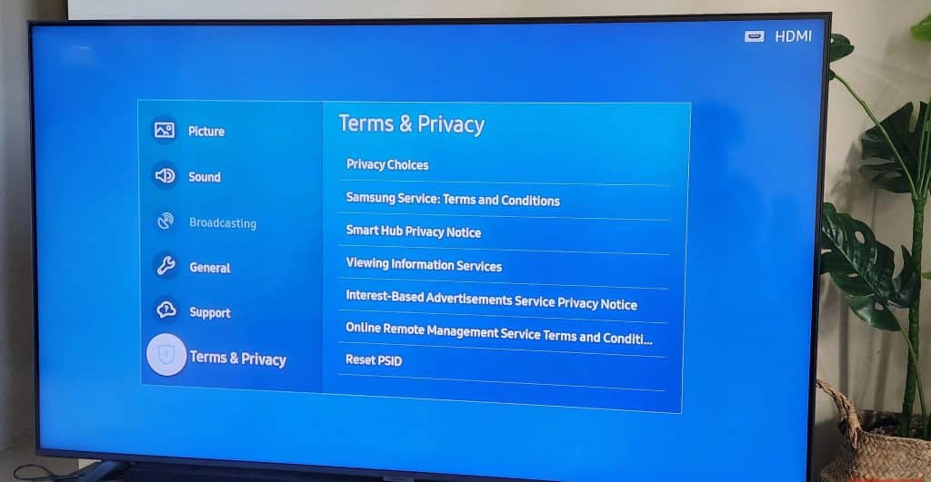 - تعطيل خاصية ACR: الخطوة الأولى لحماية تلفزيونك من جمع البيانات هي تعطيل خاصية التعرف التلقائي على المحتوى Automatic Content Recognition في قائمة إعدادات التلفزيون. ابحث عن خيارات مثل الشروط والخصوصية Terms and Privacy، أو إعدادات الخصوصية Privacy Settings، أو جمع بيانات المشاهدة Viewing Data Collection، أو خيار مشابه. يجب أن تكون قادرًا بعد ذلك على تحديد خيار إيقاف تشغيله.
