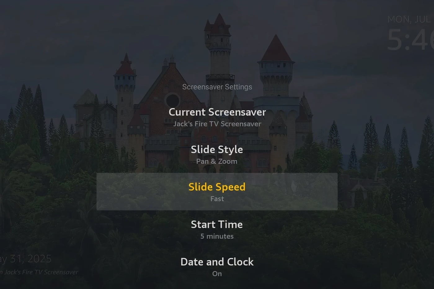 بعد اختيار الألبوم الذي أرغب في عرضه، أود تخصيص طريقة عمل شاشة التوقف. يوفر Fire TV بعض الخيارات ضمن قائمة إعدادات شاشة التوقف (Screensaver Settings). عادةً ما أقوم بضبط وقت البدء (Start Time) على 5 دقائق، بحيث تبدأ شاشة التوقف في العمل بعد فترة وجيزة من عدم النشاط.