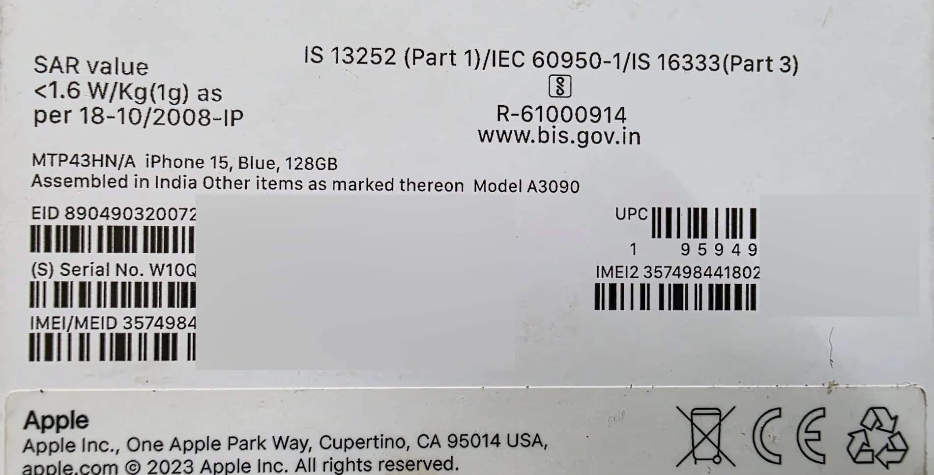 أسهل طريقة للعثور على رقم IMEI الخاص بهاتفك هي التحقق من العلبة الأصلية التي جاء بها الهاتف. عند شراء الهاتف، يأتي في علبة محكمة الإغلاق مع الملحقات ودليل المستخدم. يتم طباعة رقم IMEI على ملصق بالقرب من الرمز الشريطي (Barcode). سترى أيضًا تفاصيل أخرى مثل EID و UPC والأرقام التسلسلية.