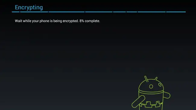اضغط على “تشفير الهاتف” ‘Encrypt Phone’ لبدء عملية التشفير. لا تفصل الهاتف لا تفسده لأي سبب من الأسباب. الأندرويد سوف يخطرك عندما يتم الانتهاء من العملية. عموما، فإنه يأخذ حوالي ساعة.