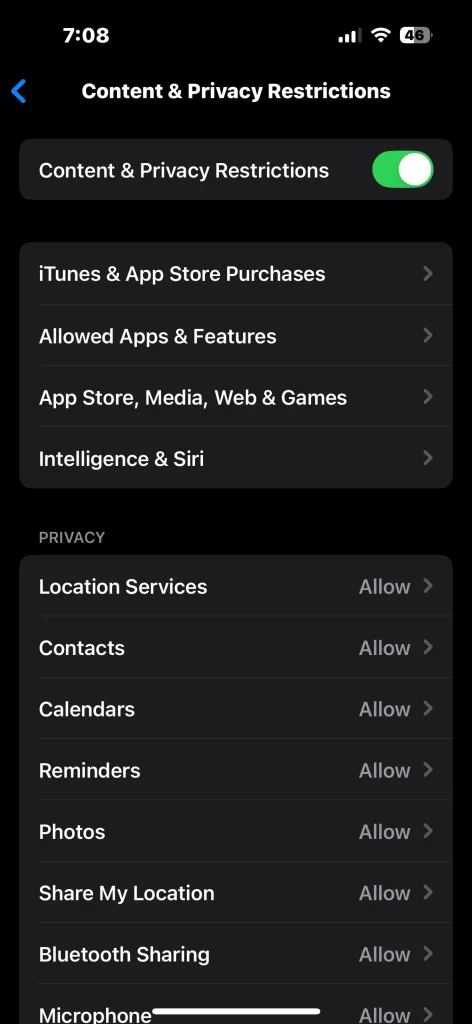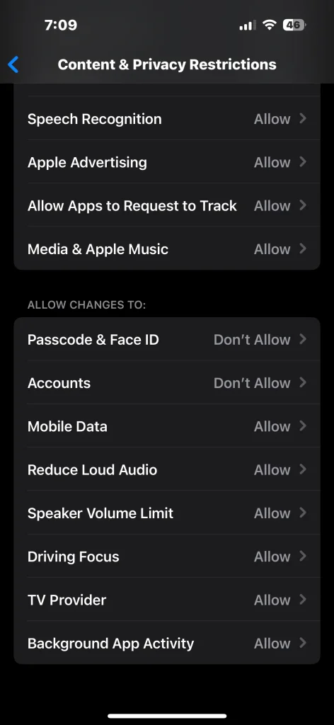 لحماية إضافية لـ iPhone الخاص بك، افتح الإعدادات وانتقل إلى مدة استخدام الجهاز > قيود المحتوى والخصوصية. قم بتفعيل هذا الخيار، ثم انتقل إلى قسم السماح بالتغييرات. افتح رمز الدخول و Face ID وقم بتعيينه إلى عدم السماح. افعل الشيء نفسه بالنسبة إلى الحسابات. من الآن فصاعدًا، سيحتاج أي شخص يحاول تعديل هذه الإعدادات إلى رمز دخول “مدة استخدام الجهاز” منفصل.