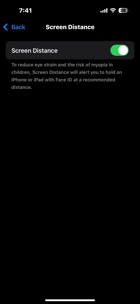 تستخدم ميزة “مسافة الشاشة” كاميرا TrueDepth لاكتشاف ما إذا كنت تمسك جهاز iPhone بالقرب من وجهك لفترة طويلة، ثم تطالبك بتحريكه بعيدًا. بمرور الوقت، يمكن أن يقلل ذلك من إجهاد العين الرقمي ويساعدك على بناء عادات مشاهدة صحية.
