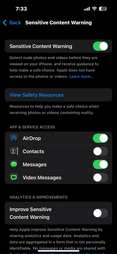 ستجد أيضًا خيارًا باسم تحسين تحذير المحتوى الحساس، والذي يشارك البيانات التي تم الإبلاغ عنها مع Apple لتحسين دقة الكشف. أنا شخصيًا أفضل إبقاء هذا الخيار مُعطلاً.