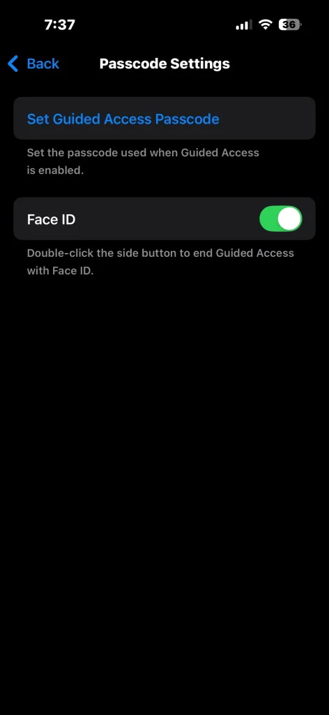 يمكنك أيضًا السماح باستخدام Face ID أو Touch ID لإنهاء الجلسة. لبدء جلسة “الوصول الموجه”، افتح التطبيق الذي تريده، ثم اضغط ثلاث مرات على الزر الجانبي (Side button) في طرز iPhone التي تدعم Face ID، أو زر الشاشة الرئيسية (Home button) في الطرز الأقدم.