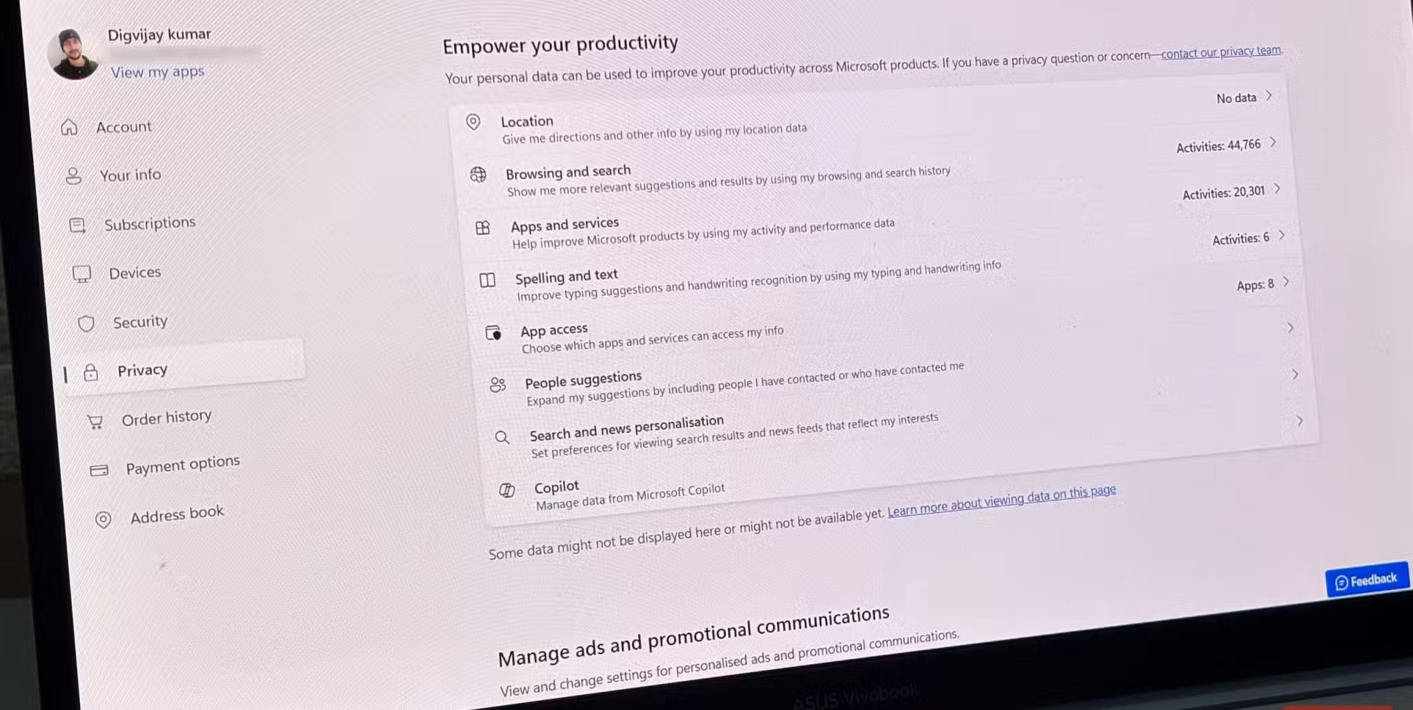 يمكنك مراجعة البيانات المرتبطة بحسابك وحذفها من خلال لوحة معلومات الخصوصية الخاصة بـ Microsoft. بدأتُ بسجل البحث والتصفح الخاص بي، ثم أزلتُ بيانات استخدام التطبيقات والخدمات ونشاط الرسائل النصية. هذه الخطوة ضرورية لاستعادة خصوصيتك وتقليل كمية المعلومات التي تحتفظ بها Microsoft عنك.