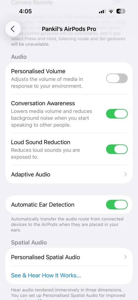 تُعد ميزة “الوعي بالمحادثة” (Conversation Awareness) وميزة “الاستماع المباشر” مجرد مثالين. تحتوي سماعات AirPods على الكثير من الميزات الأخرى، بدءًا من الصوت المكاني وحتى اختبارات السمع المدمجة، والتي تستحق التحقق منها.
