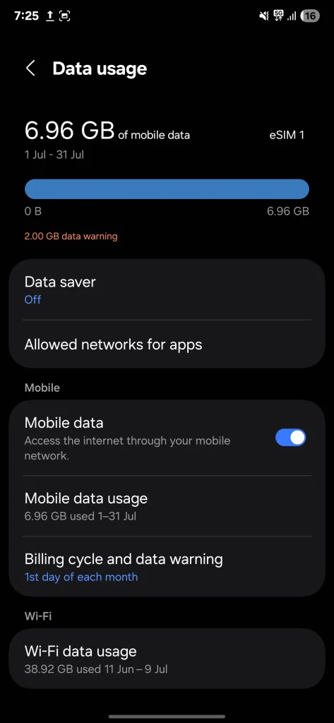 بالنسبة لبيانات الخلفية، فتحت Settings (الإعدادات)، ثم انتقلت إلى Connections (الاتصالات)، ثم Data usage (استخدام البيانات)، ونقرت على Mobile data usage (استخدام بيانات الهاتف المحمول). من هناك، حددت التطبيقات غير الضرورية وأوقفت تشغيل خيار Allow background data usage (السماح باستخدام بيانات الخلفية) حتى لا تستخدم التطبيقات البيانات عندما لا أكون أستخدمها بنشاط.