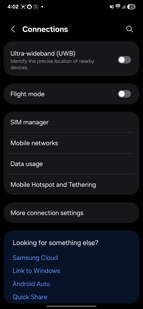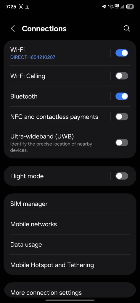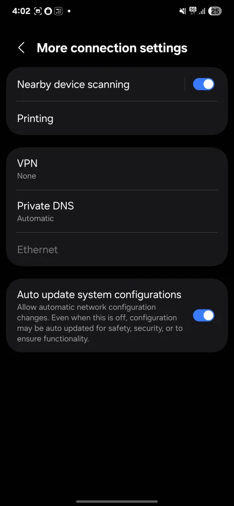 خاصية “فحص الأجهزة القريبة” (Nearby Device Scanning) تبقي كلاً من Bluetooth و Wi-Fi في وضع الفحص النشط للبحث عن الأجهزة المجاورة، حتى في حال عدم اتصالك بأي جهاز. صُممت هذه الخاصية لتسريع عملية الاقتران مع سماعات الرأس، والساعات الذكية، أو أجهزة SmartThings.