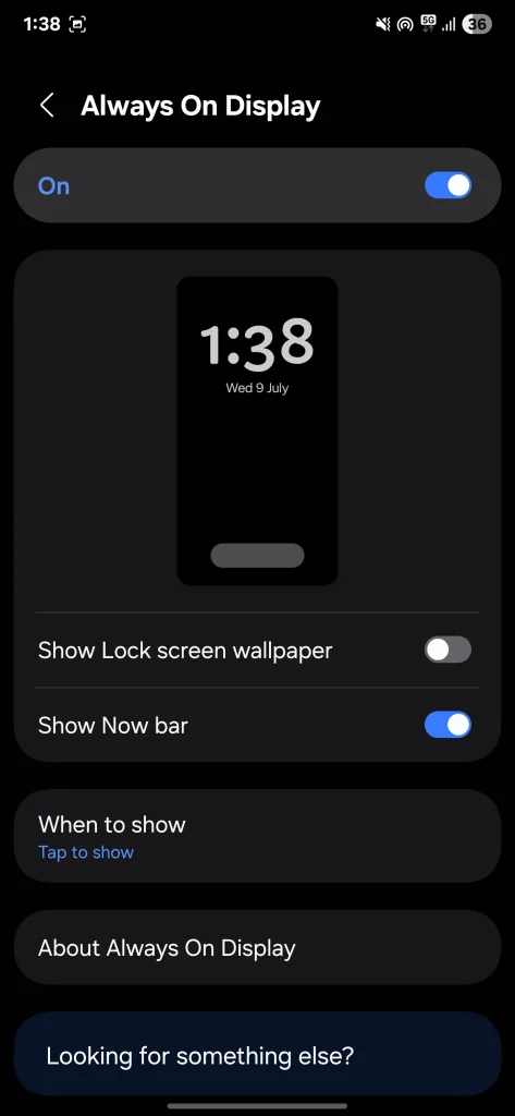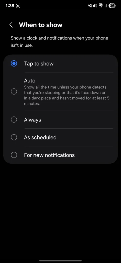ولكن إذا كنت تجد ميزة AOD مفيدة ولا ترغب في فقدها بالكامل، فيمكنك تعديل وقت ظهورها لتقليل استنزاف البطارية دون التخلي عن الميزة. ضمن قسم When to show (متى يتم العرض)، سترى بعض الخيارات: