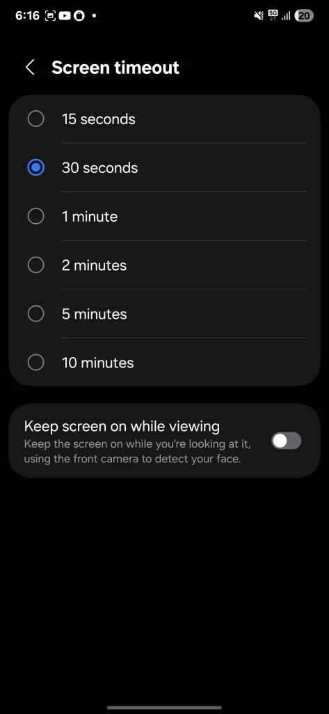 شخصيًا، أقوم بضبط مهلة الشاشة على 30 seconds (30 ثانية) فقط، بحيث ينطفئ هاتفي بسرعة عندما لا أكون قيد الاستخدام. إذا كنت أقرأ شيئًا طويلاً، أقوم بالنقر على الشاشة من حين لآخر لإبقائها نشطة. ولكن، إذا كنت تقرأ مقالات أو مستندات طويلة بشكل متكرر، فقد تفضل إبقاء خاصية “Smart Stay” مفعلة مع ضبط مهلة شاشة أقصر كاحتياطي.