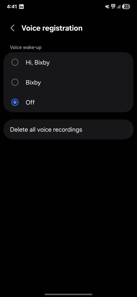 إذا كنت لا تستخدم Bixby إطلاقًا، يمكنك تعطيله بالكامل. بدلاً من ذلك، يمكنك إيقاف تشغيل ميزة الإيقاظ بالصوت لتوفير بعض الطاقة دون فقدان المساعد الرقمي بشكل كامل. ستظل قادرًا على الوصول إلى Bixby عن طريق فتح التطبيق يدويًا أو الضغط على الزر الجانبي متى احتجت إليه. هذا الخيار يمنحك مرونة أكبر في إدارة استهلاك الطاقة مع الحفاظ على إمكانية الوصول إلى الميزات الذكية.