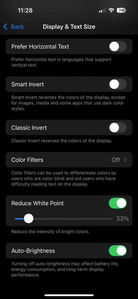 - الإعدادات > تسهيلات الاستخدام > شاشة العرض وحجم النص > تقليل النقطة البيضاء (حوالي 30 – 33%). هذا الإعداد يقلل من حدة اللون الأبيض، مما يجعله أسهل على العينين، خاصة في الإضاءة الخافتة.
