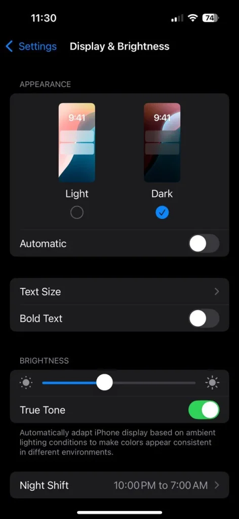 - الإعدادات > الشاشة والسطوع > True Tone: قم بتشغيل هذا الخيار. تعمل تقنية True Tone على تعديل لون الشاشة تلقائيًا ليتناسب مع الإضاءة المحيطة بك، مما يقلل من إجهاد العين ويجعل الألوان تبدو أكثر طبيعية.