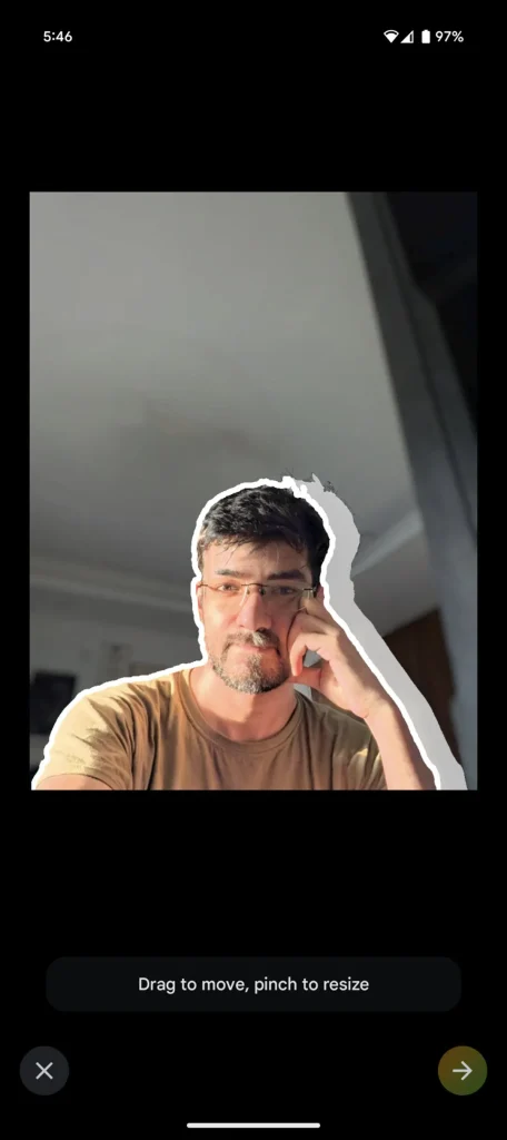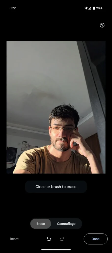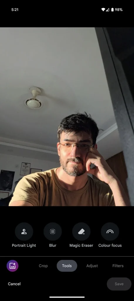 كانت هناك عدة مشاكل في هذه الصورة تتطلب الكثير من الجهد لإصلاحها، حتى باستخدام إصدار Lightroom المخصص لأجهزة الكمبيوتر المكتبية. أردت التخلص من بعض الظلال على وجهي، وإزالة مروحة السقف، وإضافة تأثير ضبابية للخلفية، ونقل العنصر الرئيسي (أو نفسي) قليلًا إلى اليسار. هنا يأتي دور **Magic Editor** في تسهيل هذه العملية.