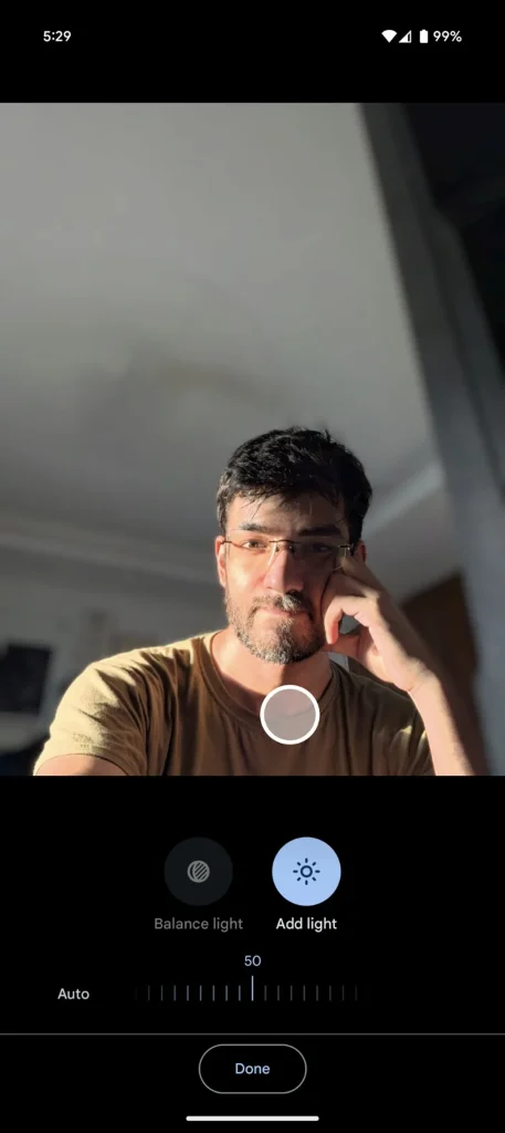 تم تصميم ميزة Portrait Light لإضافة مصدر ضوء إضافي إلى صورتك لتحسين إضاءة الوجوه. تحصل على خيار Add light الذي يضيف مصدر ضوء إضافيًا، ويمكنك استخدام خيار Balance light لموازنة الإضاءة الكلية على الوجوه.