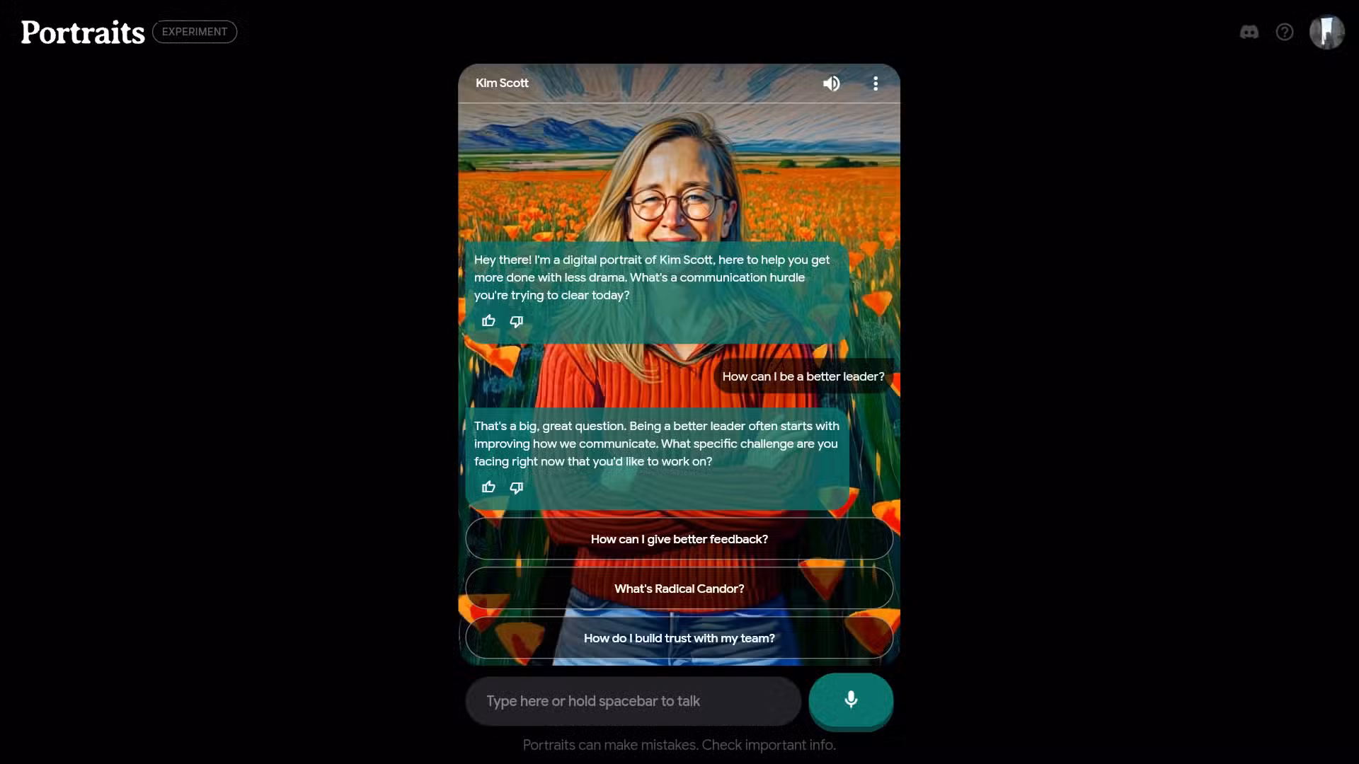 إذا كنت في الولايات المتحدة، يمكنك الاشتراك في Portraits من خلال Google Labs، وبمجرد الموافقة، يمكنك التحدث إلى Kim Scott مباشرة. ستسمع صوتها (أو نسخة من صوتها تم إنشاؤها بالذكاء الاصطناعي) يرحب بك، ويمكنك الرد عليها. تدور خبرتها حول القيادة والإدارة، لذا ستركز شخصيتها الرمزية على هذه الموضوعات.