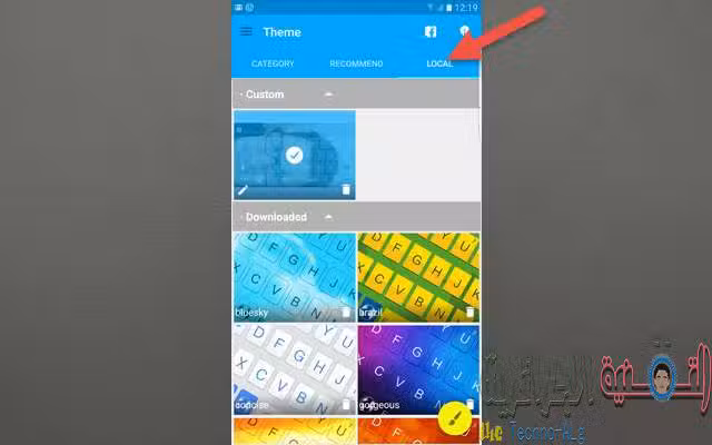 بعد تثبيته قم بفتحه ثم قم بالضغط على enable ikeyboard لتفعيل الكيبورد ، ثم على switch to ikeyboard لاعتماده الكيبورد الذي ثبته ، وبعد ذلك سجل الدخول إلى التطبيق بحسابك على غوغل أو الفيسبوك ثم قم بالضغط على قسم local واضغط على الفرشات كما في الصورة