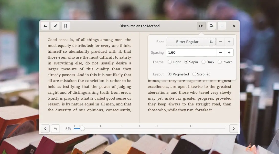 Foliate Ebook Reader عبارة عن قارئ الكتب الإلكترونية GTK المصمم بشكل جيد للغاية والمميز جيدًا لسطح مكتب Linux. يدعم التطبيق تنسيق .epub حصريًا ، وهو التركيز الذي يمكّنه من تقديم تجربة مستخدم من الدرجة الأولى.