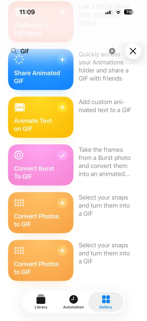 بعد التقاط مجموعة من الصور، افتح تطبيق Shortcuts على جهاز iPhone الخاص بك. إذا كنت لا تراه، فقم بتنزيله من App Store أولاً. انتقل إلى علامة التبويب Gallery في تطبيق Shortcuts وابحث عن GIF. ثم، انقر فوق رمز علامة الجمع بجوار Convert Burst to GIF لإضافة الاختصار إلى مكتبتك.