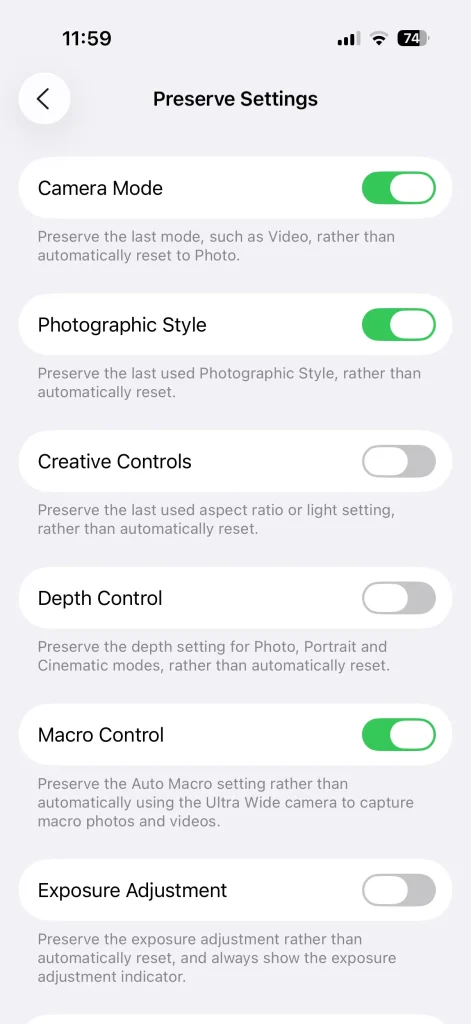 لتفعيل هذه الميزة وتخصيص إعدادات الكاميرا التي تريد الاحتفاظ بها، انتقل إلى “الإعدادات” > “الكاميرا” > “الاحتفاظ بالإعدادات”. ستظهر لك عدة خيارات، مثل “نمط الكاميرا”، و”النمط الفوتوغرافي”، و”التحكم في العمق”، و”تعديل التعريض”، و”الوضع الليلي”، و”الصور الحية”. قم بتشغيل المفاتيح بجوار الخيارات التي تريد أن يتذكرها تطبيق الكاميرا. بهذه الطريقة، ستحافظ على إعدادات الكاميرا المفضلة لديك، وستكون جاهزًا لالتقاط صور رائعة في أي وقت.