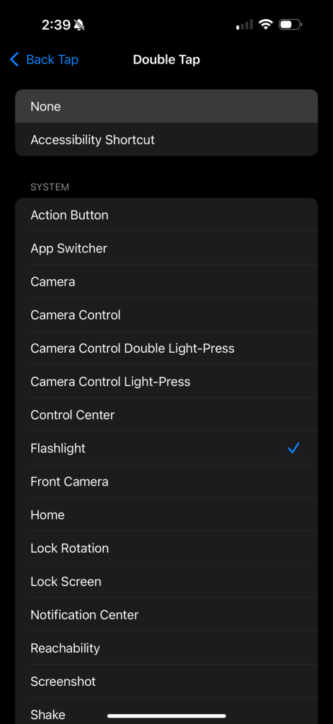 تتيح لك هذه الميزة تعيين إجراءين مختلفين: أحدهما للنقر المزدوج والآخر للنقر الثلاثي. تتضمن الإجراءات المتاحة عناصر تحكم النظام وميزات تسهيلات الاستخدام و الاختصارات المخصصة من تطبيق Shortcuts. يبدو تعيين المصباح اليدوي كإجراء للنقر الخلفي (Back Tap) فكرة رائعة حتى تتعايش معها بالفعل.