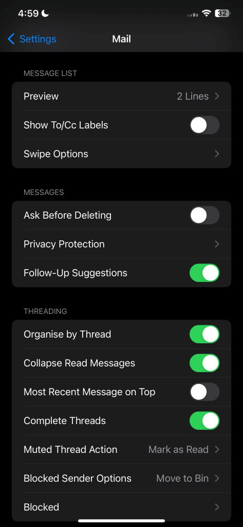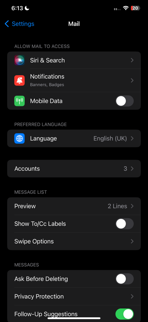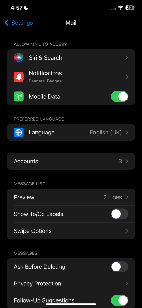 5. تخصيص إجراءات التمرير السريع في تطبيق البريد الإلكتروني على iPhone
