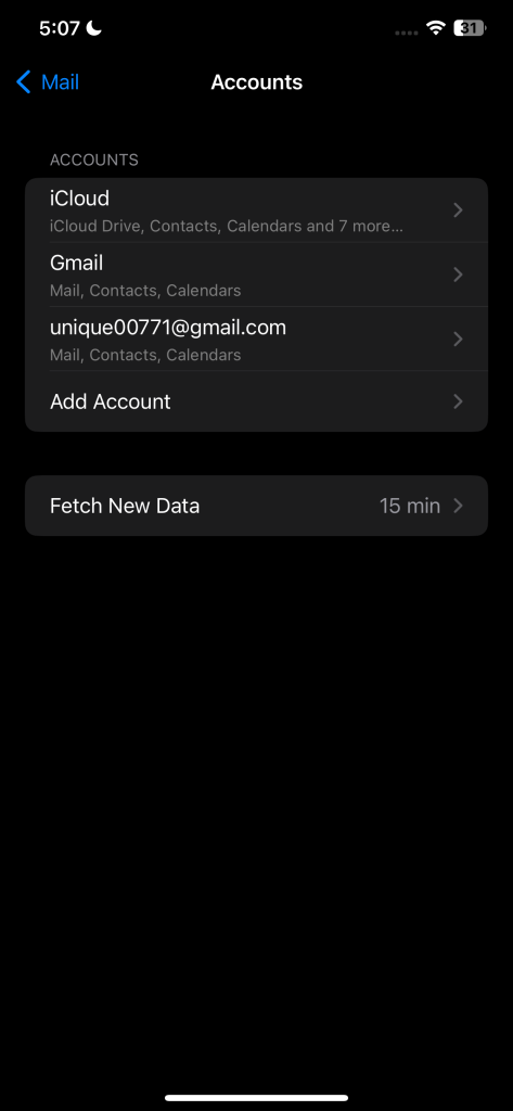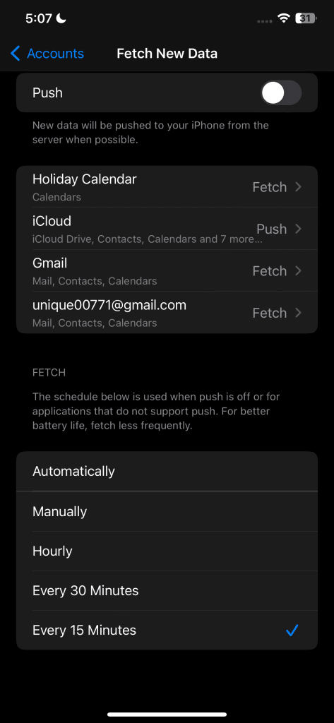 مع خيار “الجلب”، سيتحقق التطبيق من وجود رسائل بريد إلكتروني جديدة على فترات زمنية محددة – وجدت أن 15 دقيقة هي فترة جيدة لتحقيق التوازن بين الحصول على الرسائل الجديدة والحفاظ على البطارية. يُقلل هذا من تكرار عمليات التحقق في الخلفية، مما يوفر عمر البطارية ويقلل من استهلاك بيانات الإنترنت على جهاز آيفون. لإجراء التبديل، افتح تطبيق “الإعدادات”، وانتقل إلى “البريد” > “الحسابات” > “جلب بيانات جديدة”، وقم بإيقاف تشغيل “الدفع”.