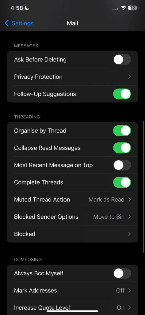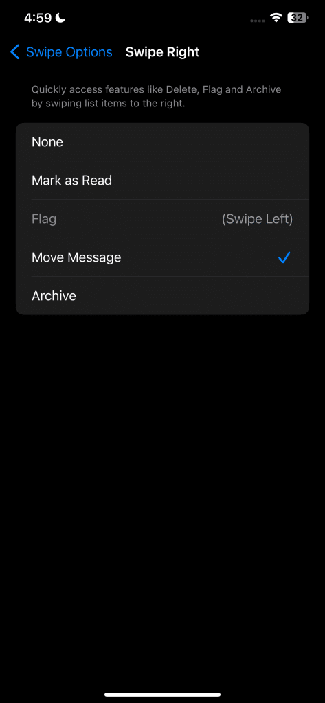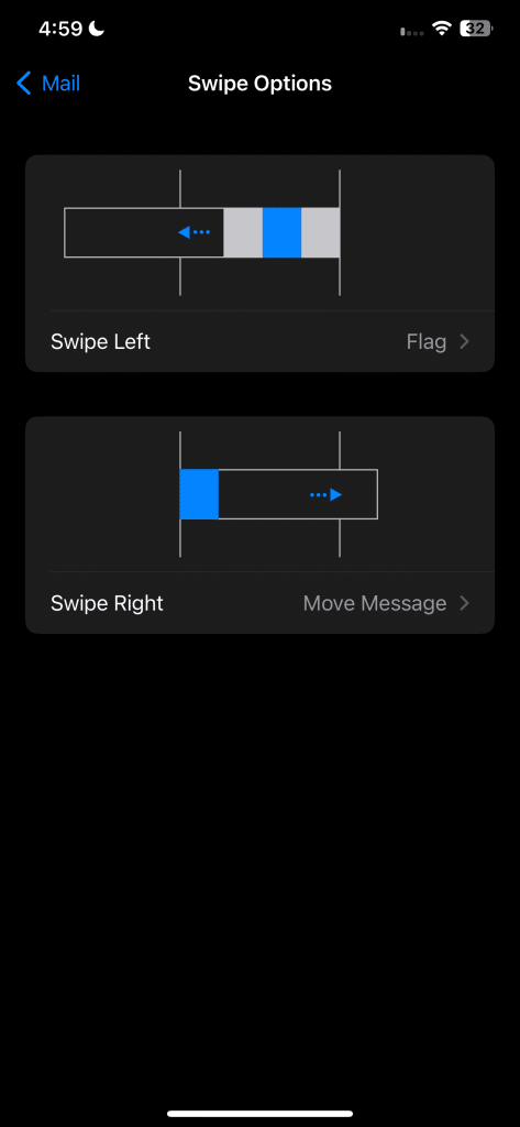 لضبط إيماءات التمرير السريع هذه، افتح الإعدادات > البريد > خيارات التمرير السريع. من هناك، انقر فوق “التمرير إلى اليمين” و “التمرير إلى اليسار” لتعديل الإجراءات لكل اتجاه تمرير سريع.