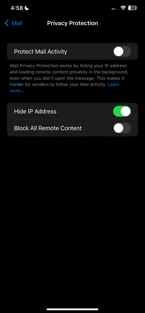 لذلك، يُنصح بتعطيل تحميل الصور عن بُعد لتحسين خصوصيتك وأمانك وأداء جهاز iPhone الخاص بك. لتعطيل تحميل المحتوى عن بُعد في تطبيق البريد، افتح الإعدادات > البريد > حماية الخصوصية وقم بإيقاف تشغيل زر التبديل الموجود بجوار “حماية نشاط البريد”.