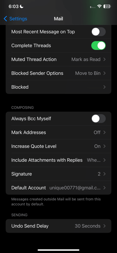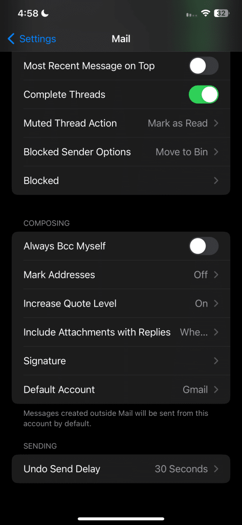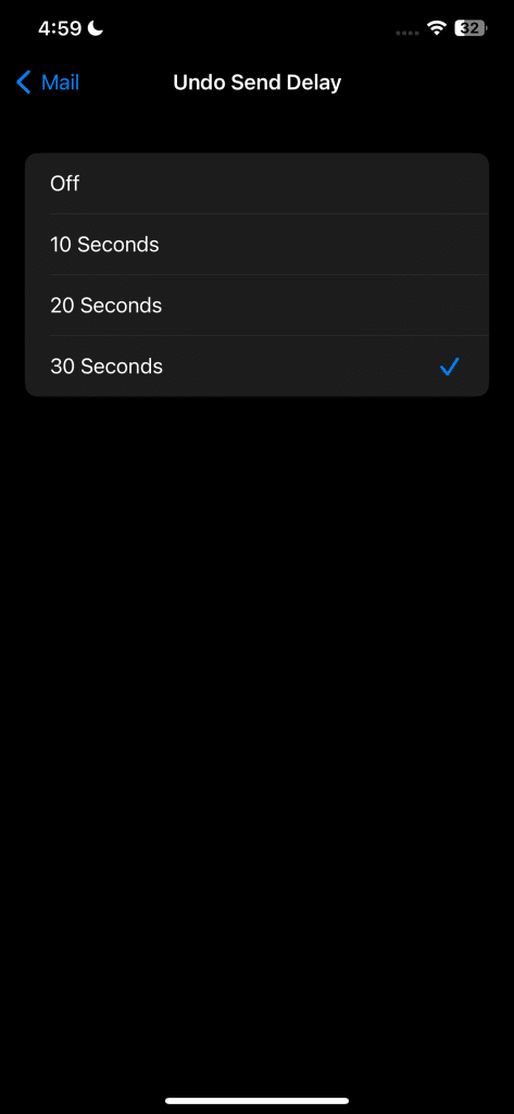من خلال زيادة التأخير، سيحتفظ تطبيق البريد الإلكتروني من Apple بخيار التراجع مرئيًا لمدة تصل إلى 30 ثانية، مما يمنحك متسعًا من الوقت لاسترداد رسائل البريد الإلكتروني قبل أن تغادر علبة الصادر. لـ تمديد مهلة تأخير التراجع عن الإرسال، انتقل إلى الإعدادات > البريد، ثم حدد خيار “مهلة تأخير التراجع عن الإرسال” ضمن إرسال. اختر إما “20 ثانية” أو “30 ثانية” وستكون جاهزًا.