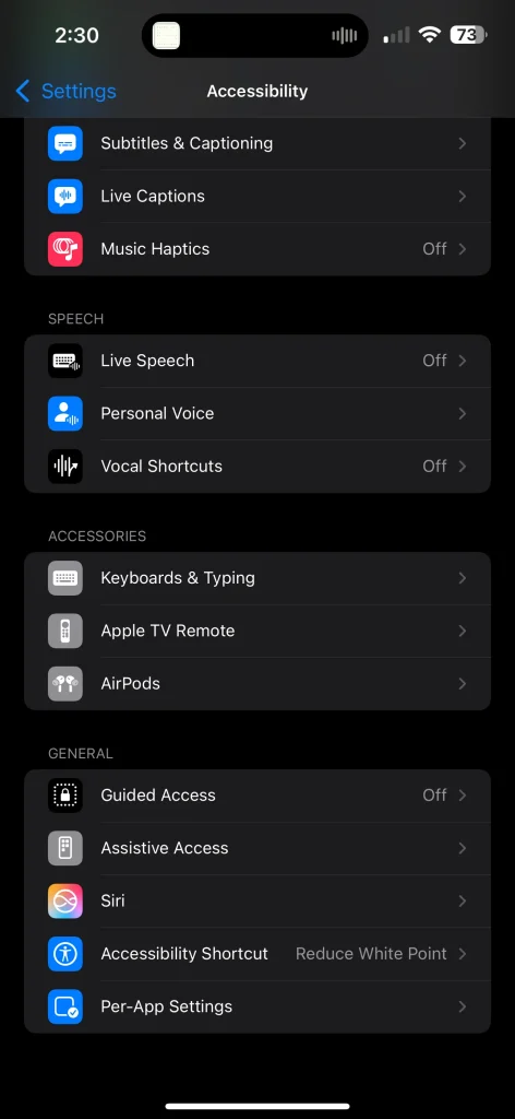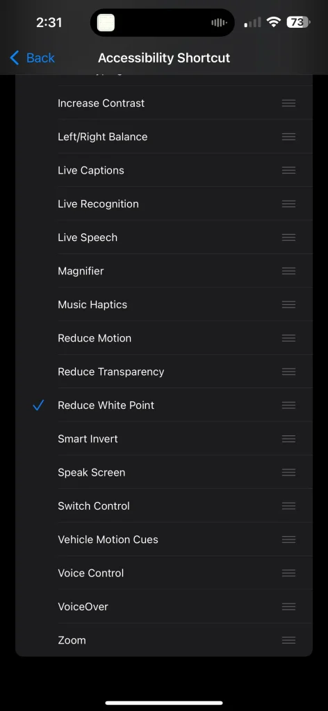 أسرع طريقة لضبط هاتفك لتقليل النقطة البيضاء هي إعداده باستخدام وظيفة “الاختصار إمكانية الوصول” في iPhone، والتي تتيح لك تعيين عدد من الإعدادات ليتم فتحها أو تنشيطها عند الضغط على الزر الجانبي ثلاث مرات بسرعة.