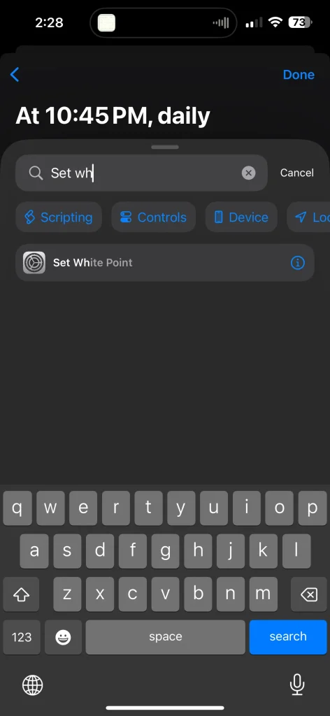 6. حدد أتمتة فارغة جديدة (New Blank Automation)، ثم ابحث عن تعيين النقطة البيضاء (Set White Point) وحددها. تأكد من أن كلمة التبديل الزرقاء تقول تشغيل (On) ثم اضغط على تم (Done) في الأعلى لإكمال الأتمتة.