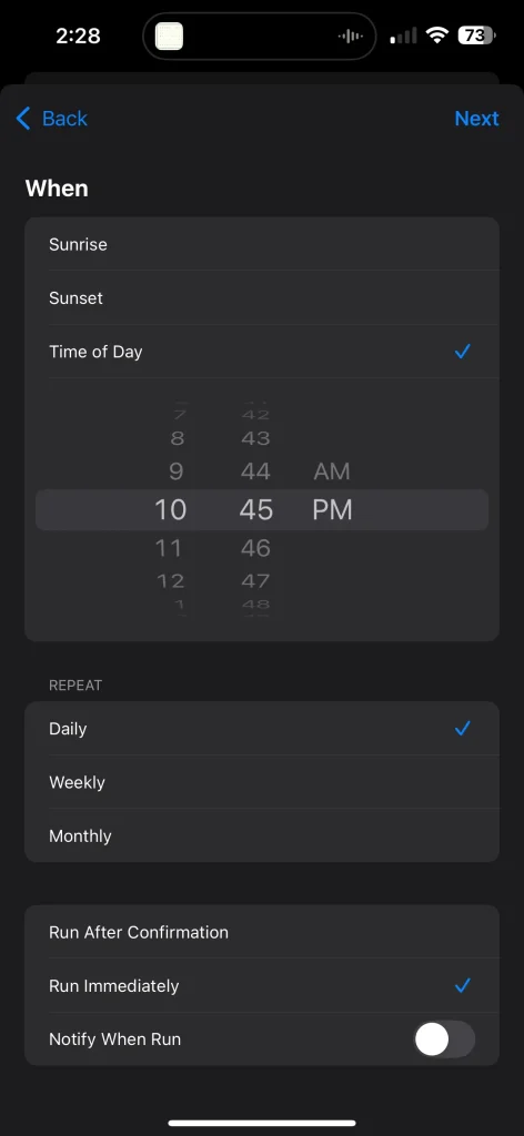 5. اضبط تكرار التكرار (Repeat) على يوميًا (Daily)، ثم قم بتبديل خيار تشغيل فوري (Run Immediately). للحصول على أتمتة أقل تدخلاً، تأكد من إيقاف تشغيل خيار إعلام عند التشغيل (Notify When Run) واضغط على التالي (Next) في الأعلى.