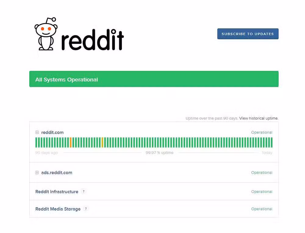 Reddit Status هي خدمة تابعة لـ Reddit تنشر تحديثات حول حالة النظام الأساسي. فهي تتتبع أنظمة Reddit المُختلفة، بما في ذلك موقع Reddit الرئيسي والمنصة الإعلانية، بالإضافة إلى البنية التحتية للمنصة وتخزين الوسائط.