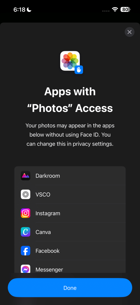- قد تظهر مطالبة تعرض التطبيقات التي لديها بالفعل إمكانية الوصول إلى تطبيق الصور الخاص بك. بالنسبة لهذه التطبيقات، قد تكون صورك قابلة للوصول دون استخدام Face ID. انقر على تم في المطالبة للمتابعة.