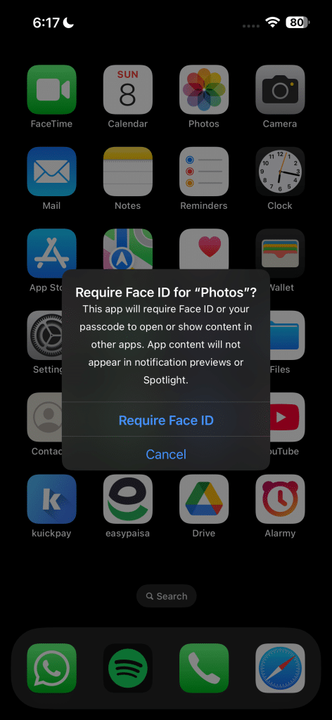 - سيظهر لك مُطالبة تطلب منك التأكيد ما إذا كنت ترغب في قفل تطبيق الصور باستخدام Face ID أو Touch ID أو رمز المرور. قم بالتأكيد من خلال النقر على طلب Face ID/Touch ID/رمز المرور.