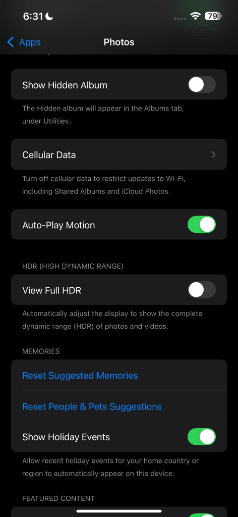 لحسن الحظ، يمكنك اتخاذ خطوة أخرى وإخفاء ألبوم المخفية أيضًا. للقيام بذلك، انتقل إلى الإعدادات > التطبيقات > الصور وقم بإيقاف تشغيل المفتاح الموجود بجوار إظهار ألبوم المخفية ضمن قسم الألبومات.