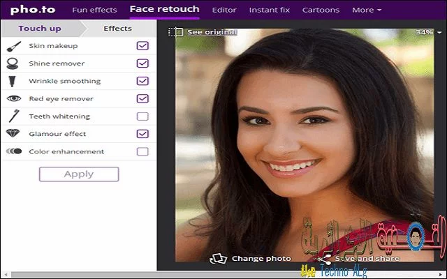هو واحد من المواقع الرائعة جدا الذي يوفر لك عدة أدوات لجعل صورتك أفضل وإزالة العيوب عليها قبل مشاركتها مع أصدقاءك ، فبعد أن تقوم بالدخول إليه تضغط على enhance your photo ،وستنبثق نافذة صغيرة، تختار فيها رفع صورتك عبر الحاسوب أو من الفيسبوك ، وبعد اختيارها ستجد عدة أدوات لجعلها تبدو أفضل وإزالة العيوب عنها.