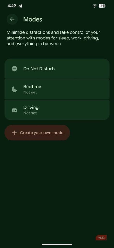 يمكن لمستخدمي Android استخدام خاصية “عدم الإزعاج” لتحقيق تأثير مماثل. فهي تتيح لك تقييد الإشعارات خلال ساعات محددة مسبقًا، مع توفير خيار السماح ببعض جهات الاتصال والتطبيقات المحددة حتى لا تفوتك التنبيهات الهامة. بدلاً من ذلك، يمكنك استخدام تطبيقات خارجية مثل Buzzkill أو Focus Friend لإدارة الإشعارات المسموح لها بمقاطعتك خلال ساعات العمل.