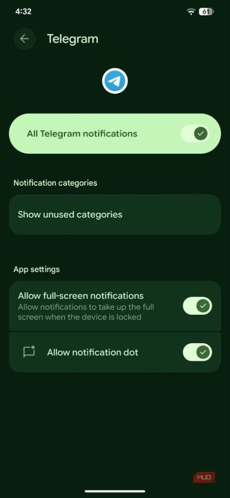 يمكن لمستخدمي Android النقر على اسم التطبيق في قسم “إشعارات التطبيق” وإيقاف تشغيل زر “الصوت والاهتزاز” لتحقيق نفس النتيجة. على أجهزة Pixel التي تعمل بنظام Android 16، يتم إخفاء زر “صامت” داخل فئات الإشعارات المختلفة، ويجب عليك إسكات كل فئة لتطبيق ليتم كتمه بالكامل.