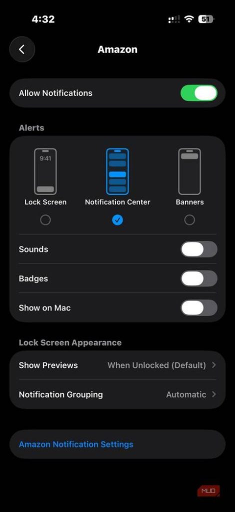 قم بإعداد الإشعارات الصامتة على جهاز iPhone الخاص بك بالانتقال إلى قسم “الإشعارات” في “الإعدادات”، وتحديد التطبيق، وتمكين زر “السماح بالإشعارات”، ثم إيقاف تشغيل زر “الأصوات”.