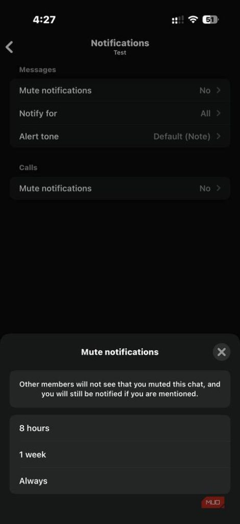 تتيح لك معظم تطبيقات المراسلة الرئيسية، بما في ذلك iMessage و WhatsApp، كتم صوت الدردشات الجماعية إما إلى أجل غير مسمى أو لفترة محددة. في معظم الحالات، يمكنك القيام بذلك عن طريق فتح الدردشة الجماعية، والوصول إلى إعداداتها، والضغط على زر كتم الصوت. ومع ذلك، في iMessage، يمكنك أيضًا التمرير سريعًا إلى اليسار على الدردشة الجماعية للوصول إلى زر كتم الصوت بسرعة.