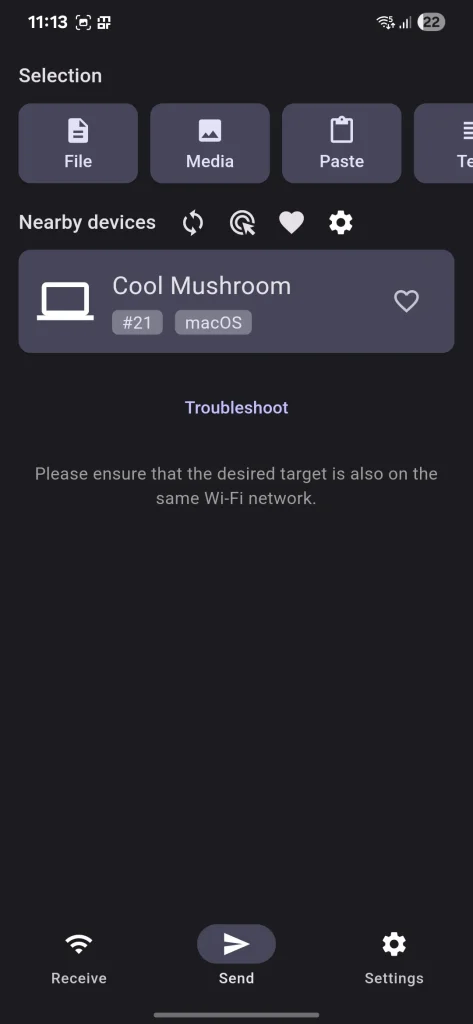 لا تحتاج إلى أن تكون على نفس العلامة التجارية للجهاز أو تسجيل الدخول إلى أي حساب؛ ما عليك سوى الاتصال بشبكة Wi-Fi نفسها، وستكون جاهزًا. يمكنك إرسال الصور والملفات والنصوص وبيانات الحافظة وحتى المجلدات بأكملها. إنه يعمل بشكل كامل على الشبكة المحلية أيضًا، مما يعني أنه لا يتم تحميل أي شيء إلى السحابة، ولا توجد إعلانات أو أدوات تتبع.