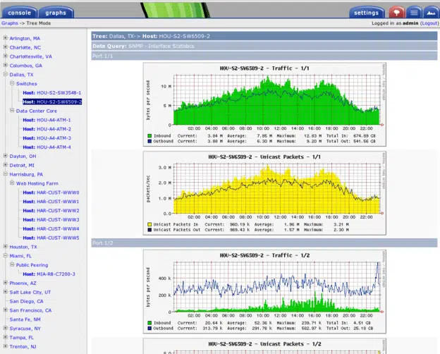 Cacti هو RRD (قاعدة بيانات روبن المستديرة) وأداة تسجيل البيانات التي تعرض الرسوم البيانية بشكل جميل ومفصل، يحتوي Cacti على وحدة MRTG (الرسوم البيانية لحركة مرور جهاز التوجيه المتعددة) التي يمكنها تتبع وقياس حركة مرور جهاز التوجيه مثل وقت العملية على الخادم ، والحزم المفقودة ، وحركة مرور الشبكة الفعلية ، وما إلى ذلك. واحدة من أكبر مزايا أدوات الشبكات Cacti ليس فقط تتبع وجمع البيانات ولكن يمكن أيضًا تمثيل البيانات بالطريقة التي تريدها تقريبًا. هذا مفيد جدًا لمقارنة النتائج ومعالجتها عند الحاجة.